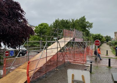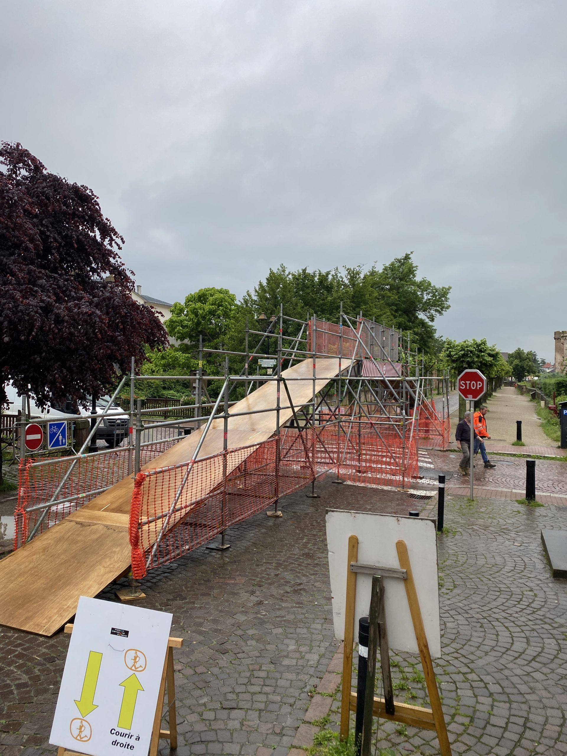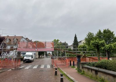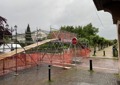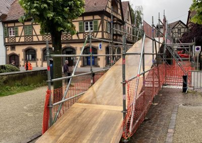 d’une passerelle pour permettre le passage des coureurs au dessus de la rue tout en permettant la circulation des véhicules entrant ou sortant de la ville. Passage largeur 6m / hauteur 2m30 + 1 rampe à chaque extrémités - de 16 Tonnelles pliantes